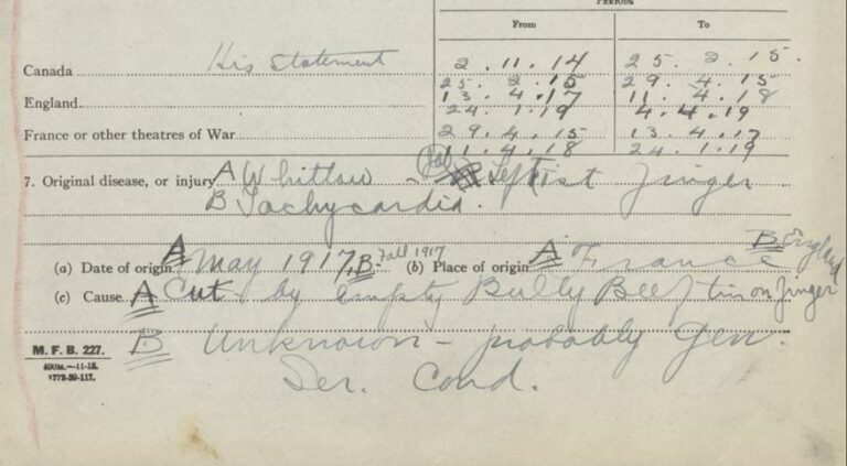 Image: An excerpt from Private Sparks’ military service file, noting his incident with a bully beef tin (Library & Archives Canada)