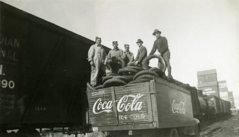 Image: Men posing on the back of a truck loaded with tires that have been collected for the war effort. The truck has “Drink Coca Cola ice cold” painted on the back and side, and is parked alongside a train. “1942” is written on the back of the photograph. (SPRA 636.10)