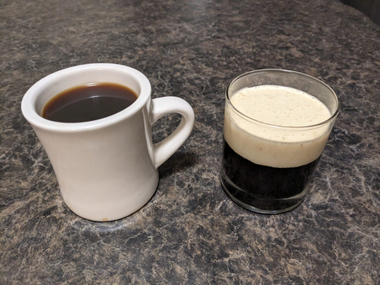 Unfortunately, as you can see from the image above this did not happen in my own testing. The grounds never settled at the bottom of the pot, so what I had was an extremely gritty cup of coffee. My guess to the cause it that the Household Science recipe only uses 1 teaspoon of egg white rather than the whole egg; there just wasn’t enough to clarify the whole pot of coffee. To change gears let’s try out the second recipe which surprisingly incorporates eggs directly into the final drink.