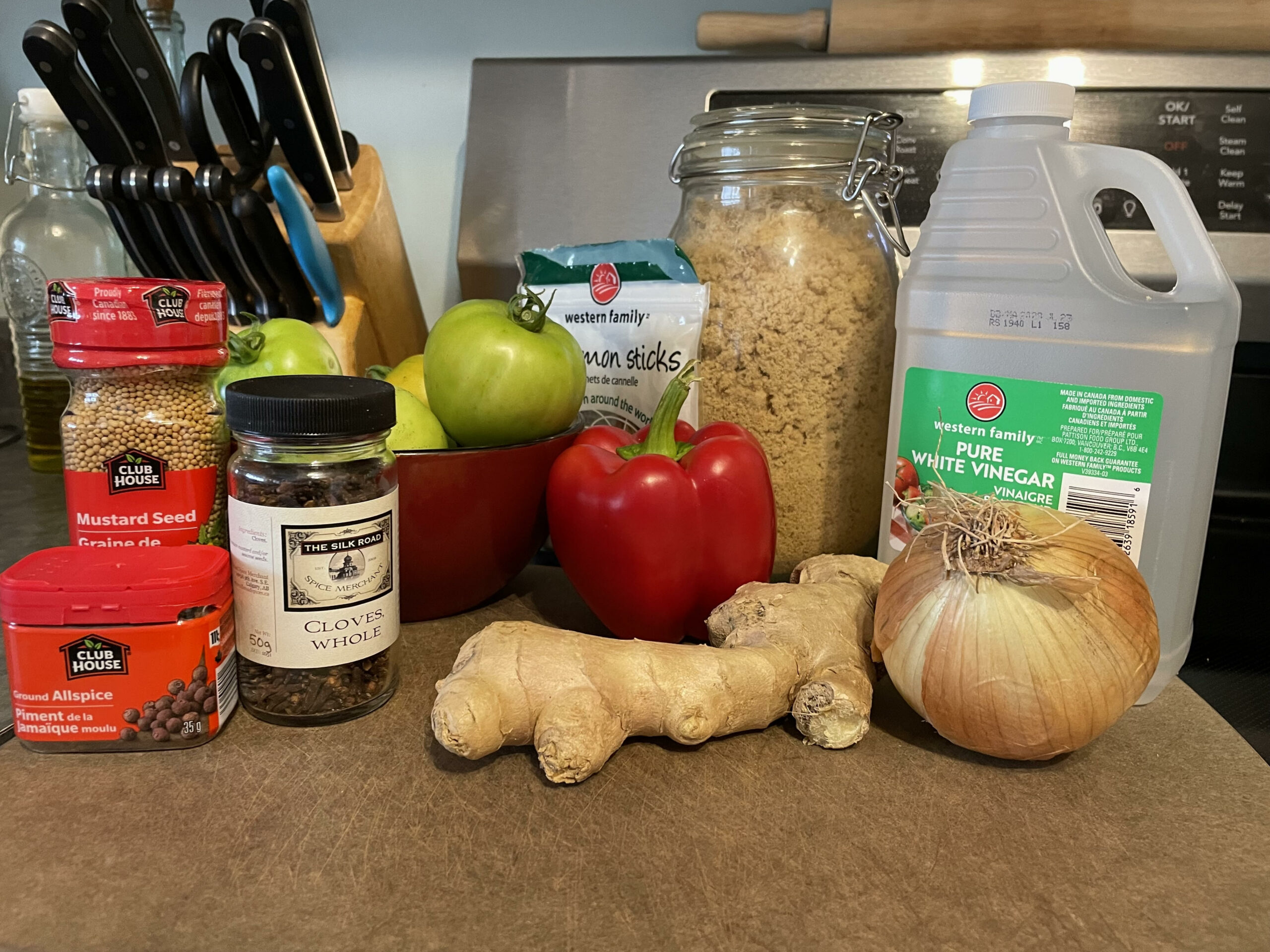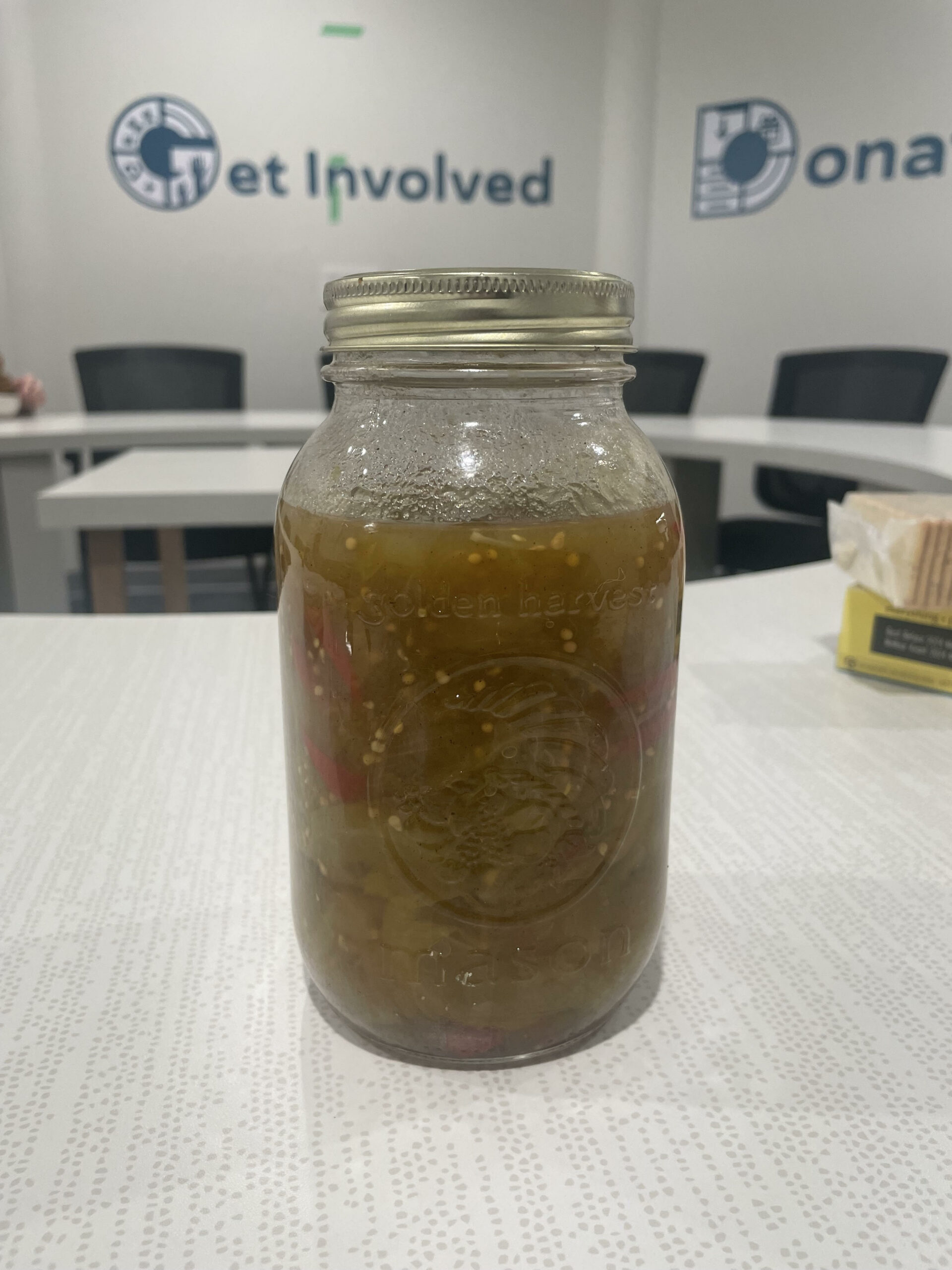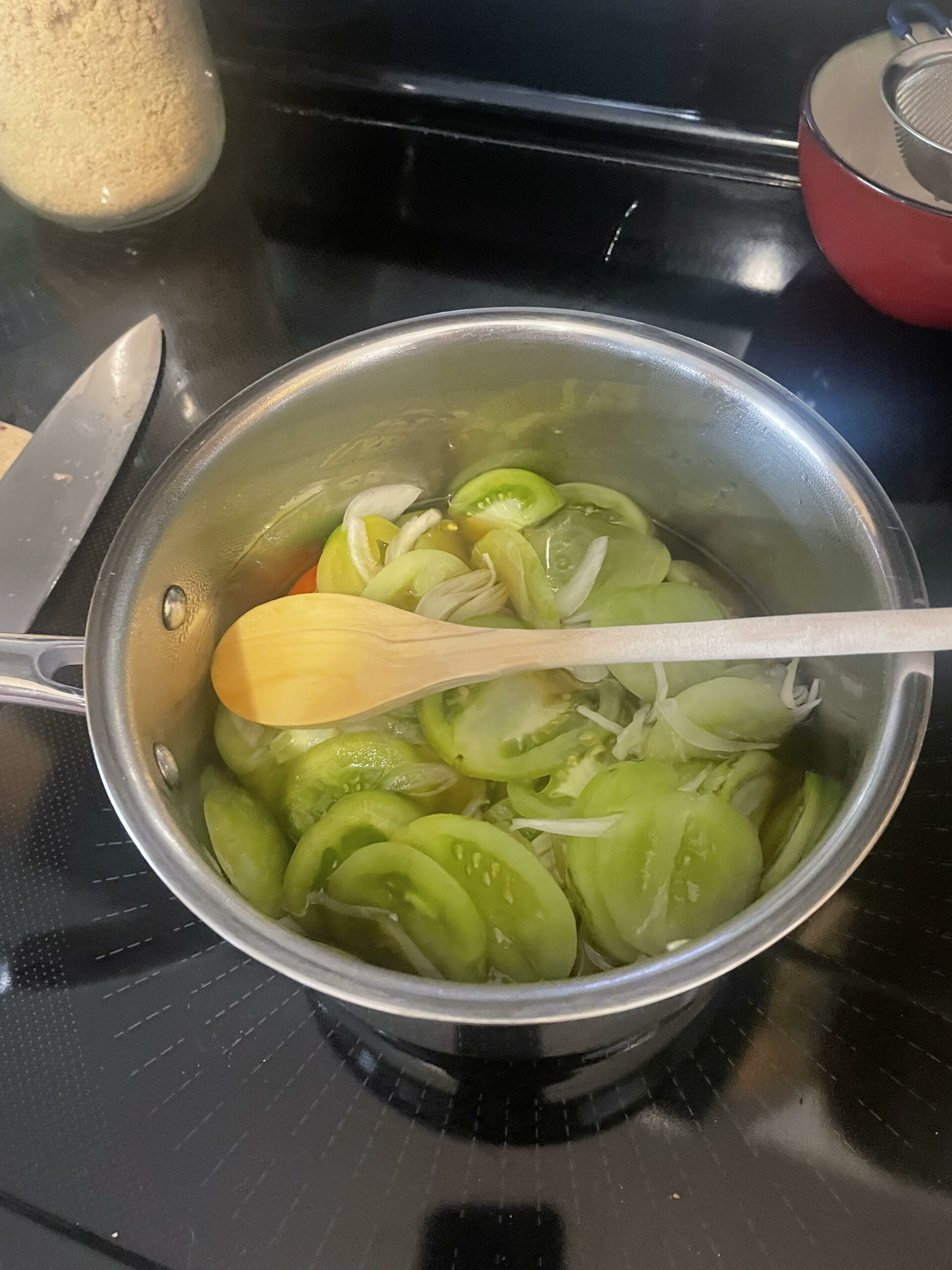 Armed with the translated measurement for the tomatoes, I was able to get started on the recipe. Since this was meant to be a trial, I quartered the recipe to make only one large jar of pickles, using 5 tomatoes. After slicing the tomatoes and the onion, I layered them with salt to pull the moisture out overnight. The following morning, I heated the vinegar, sugar, spices and peppers to the boiling point and then added the tomatoes and onion and cooked it on low for one hour. I tried not to bring the heat up too high, because I didn’t want to overcook the tomatoes and end up with a tomato sauce. Unfortunately, my packet of spices opened during the cooking so some mustard seed was mixed into the brine, but otherwise the cooking process went fairly smoothly.