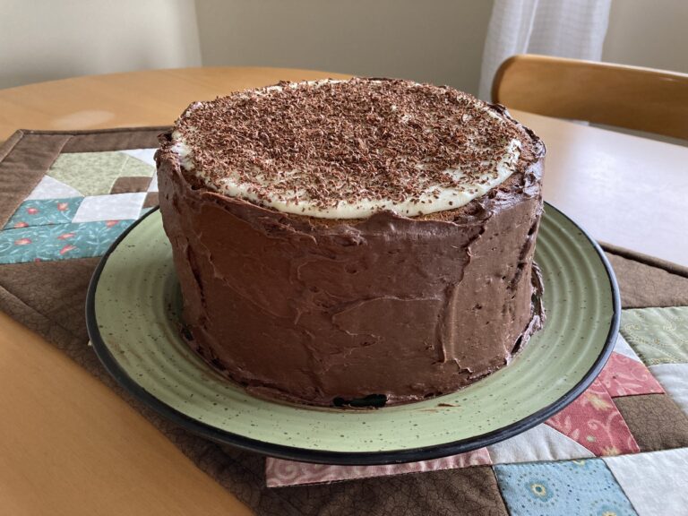 The orange frosting that went on top mystified me, as it contained an uncooked egg white and not just orange juice for flavor, but orange pulp. I removed all of the skin from the orange sections to ensure a smooth-as-possible texture. To my surprise, the orange frosting held its shape remarkably well, despite being rather soft. According to the instructions, I added melted chocolate to the orange frosting after spreading a generous amount on top of the cake to create the filling that went between the layers. I ended up adding cocoa, powdered sugar, and sour cream to the frosting after filling the cake since there was not enough left to cover the outside. This was a departure from the recipe, but I didn’t want to present my mom with a half-frosted birthday cake, even in the interest of historical accuracy.
