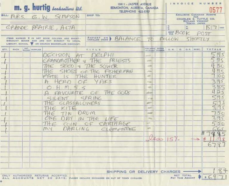 The Grande Prairie Book Club functioned as a space beyond one of simply discussing and reviewing literature. The club also provided a space for its members to delve into subjects that pertained to their interests. In the October 1943 meeting, the minutes record that, “The paper read by Mrs. Carlisle paid glowing tribute to two women of history, Sappho the poetess of Lesbos, & Deborah, Judge & Ruler of Israel.” More serious and practical topics were also discussed amongst the group. The minutes of the February 1972 meeting read: