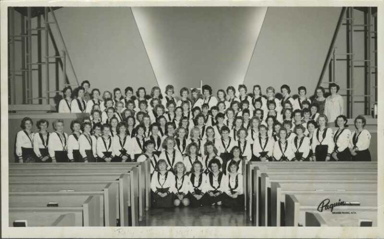 The Honeybees were an active CGIT group in Grande Prairie in the 1960s. They were a part of St. Paul’s United Church. In their own words, “Through the experience of thinking, playing, working, worshipping, and learning new skills together, the girls develop habits of living consistent with their growing understanding of the Christian faith.” The group became known as the Honeybees because of their leader, the dedicated Mrs. Rosamond Wilson. She was better known by her nickname, “Honey.” Mrs. Wilson led the girls for six years. Each girl held a specific role in the group, ranging from secretary to treasurer. The girls kept their own minute books, passed motions, and even crafted financial reports.