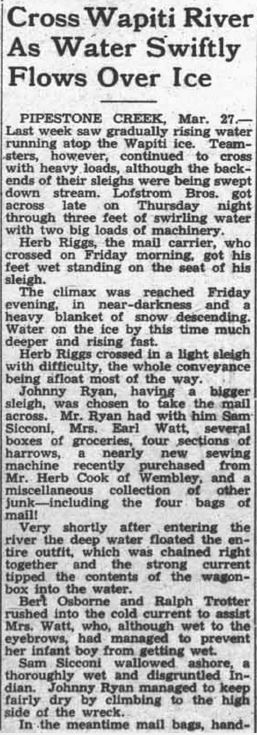 We’ve posted about ice boat runaways, ice carnivals, and cutting ice, but this 1939 report from Pipestone Creek about people crossing the Wapiti River when there was three feet of water over the ice takes the cake! An item following this report says that an $8 basket to cross the river on the ferry cables could save a life during the dangerous spring and fall. A bridge wasn’t built over the Wapiti until 1958, and it was south of Grande Prairie. The Wembley ferry operated until 1970, but winter crossings were still on the ice for many years, with crossings during the spring thaw the most hazardous.