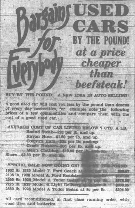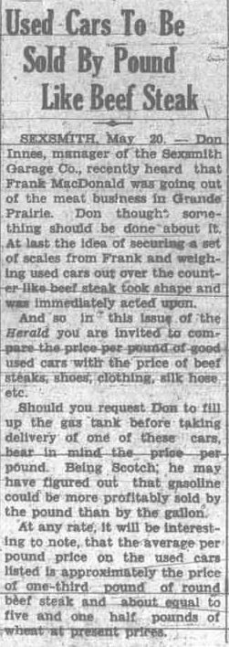 We are accustomed to the gimmicks used to sell “pre-owned” cars, but in 1933, Don Innes of Sexsmith thought up a doozy! He was going to sell used cars by the pound like beef steak. It’s such a novel idea that it wouldn’t surprise me to see it being tried locally. I am learning from the old newspaper ads that all the hype and hoopla of today isn’t all that new.