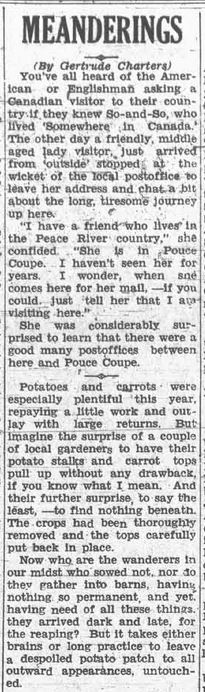 Gertrude Charters is someone I remember being connected with the newspaper, and she eventually became the Editor. This is the first column I have noticed that she wrote. The first part is something we have all heard about and may have experienced. Something quite novel, however, is the garden raiders who went to a lot of trouble to hide their crime.