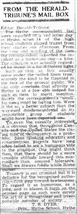I noticed the letter to the editor first, then went back and looked up the Hythe News item the letter was referring to. While I do see the principal’s point, there’s also some part of me that thinks, “lighten up!” The incident took place late in June, when school was almost over for the year, and I wonder how much school work was really missed by the students who skipped class. Also kind of fun is how the Hythe reporter managed to write it up without saying what actually happened.