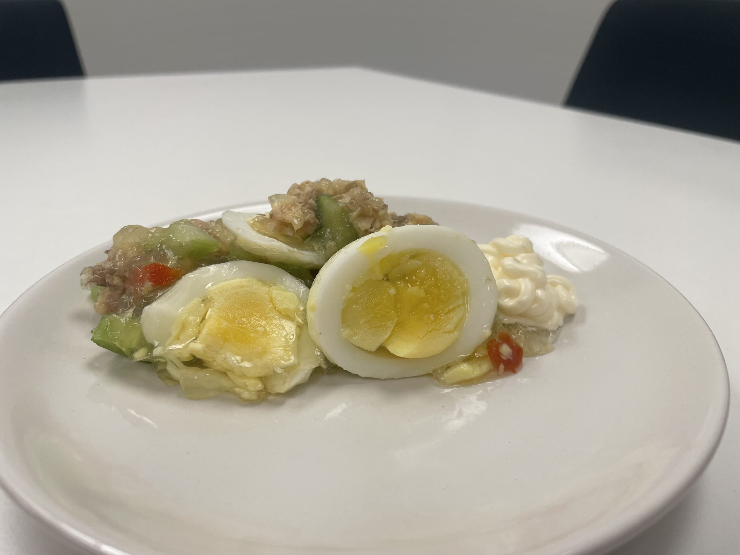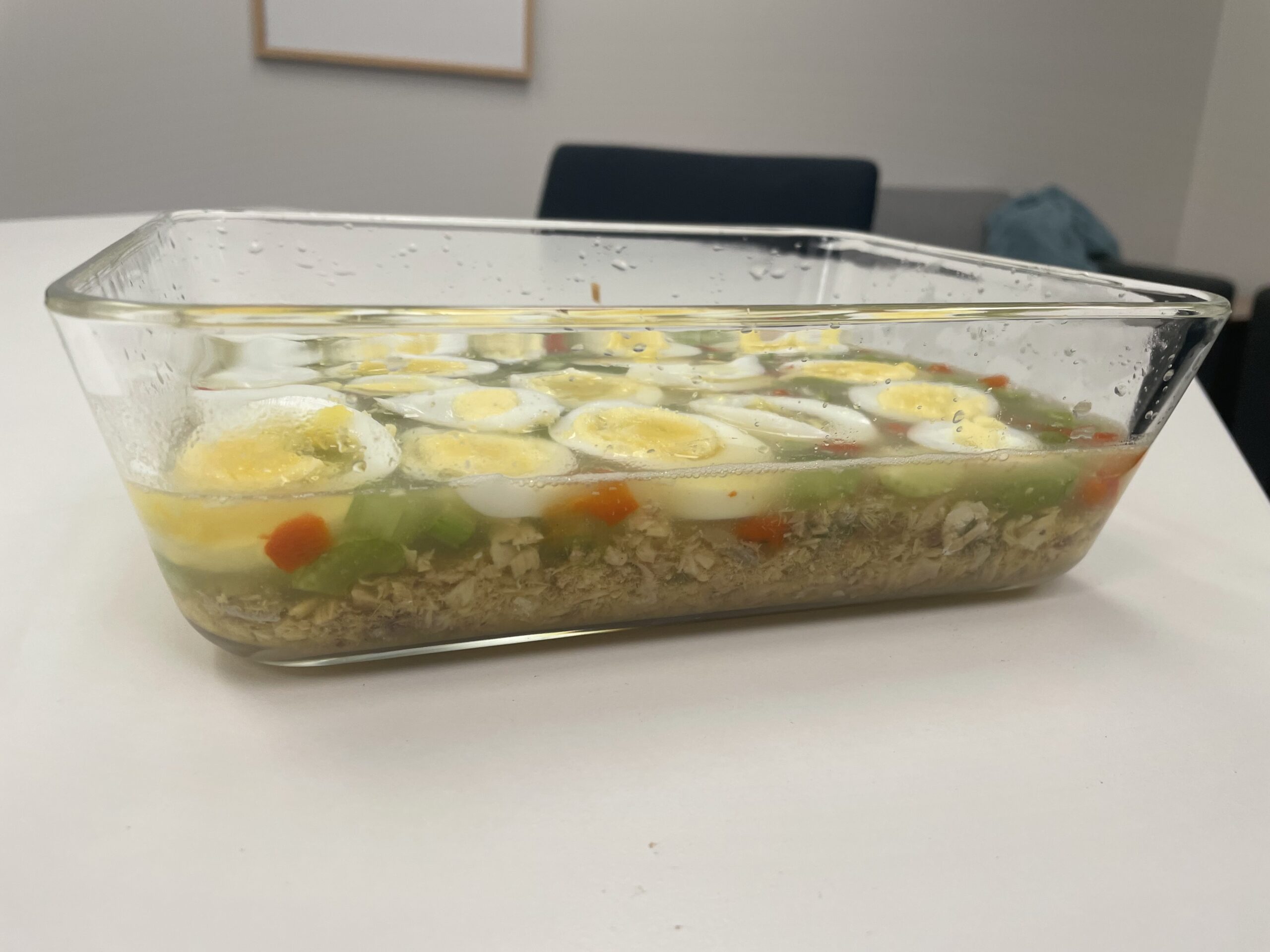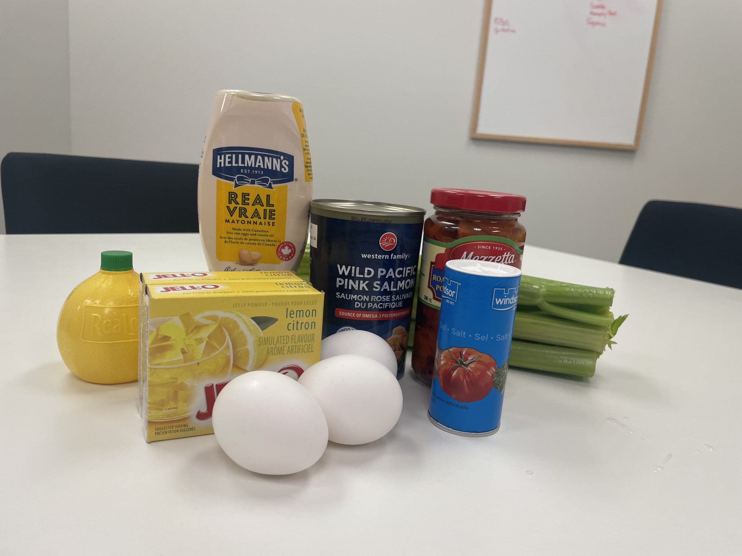 To be honest, the actual creation of this dish was very simple. Since I don’t have a Jello mold I combined them all in a glass dish and left it to set overnight. The difficulty came in the unmolding process. I think the salmon at the top broke up the jello too much, so it did not have the structural integrity needed and fell apart. While the presentation suffered the final product actually tasted alright. I’ll be the first to admit I wasn’t expecting great results but I served it with mayonnaise as suggested. Overall, the salmon was the most powerful flavour. The celery and eggs helped balance it out, but I honestly could not taste much of the lemon Jello in the mix.