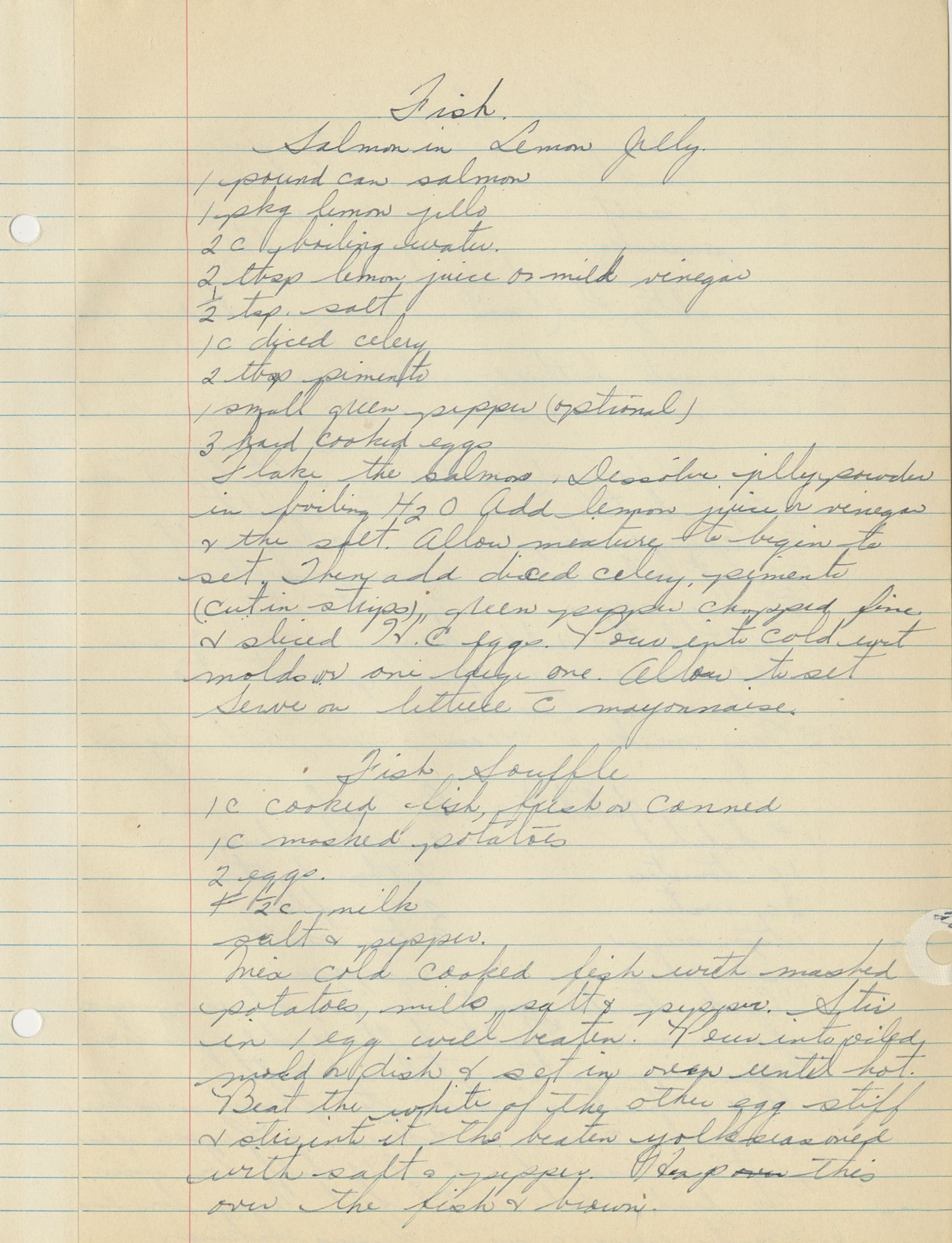 No historic cooking series would truly be complete without at least one bizarre mid-century Jell-O combination, which is why this month, we decided to tackle Salmon in Lemon Jelly! This recipe is from Betty Welter’s personal cookbook. Elizabeth, or Betty, grew up in the South Peace in the early 20th Century. Among her many other projects, she worked to develop her own cookbook, which included this recipe.