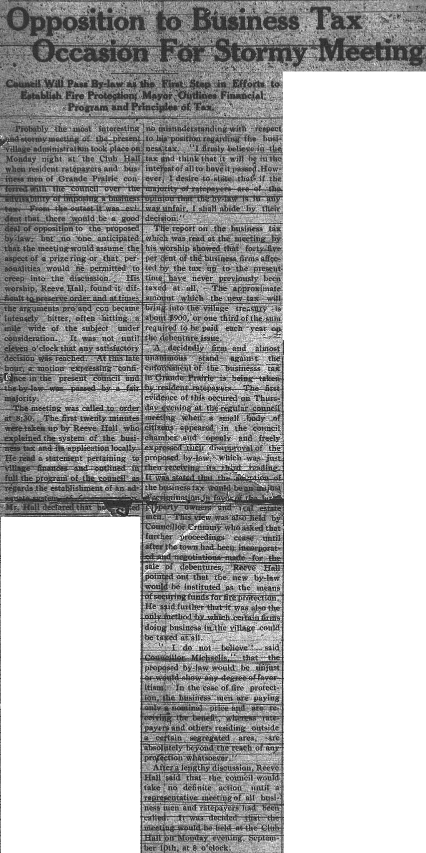 We haven’t looked in on the doings of the Village Council for a while, so when I saw the article headlined Stormy Meeting, I thought it would be worth exploring.  The week before, Council announced it would inaugurate a Business Tax.  The revenue from the tax was to be used for fire protection, and was estimated to be $900 per year.  The stormy meeting the next week didn’t seem to resolve the issue, so it was decided to hold another meeting!  The settlers were so proud that the village was growing, but perhaps they hadn’t thought of the consequences, such as the provision of various services.  Then as now, the imposition of a tax was hotly debated but usually inevitable.