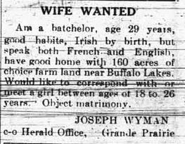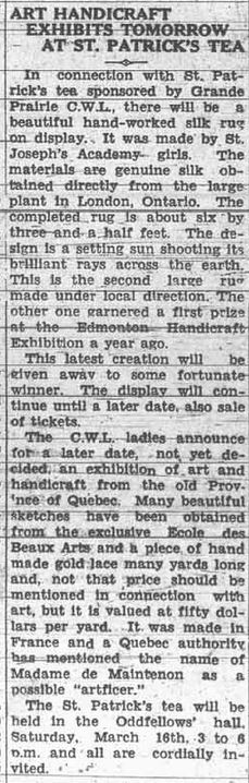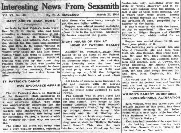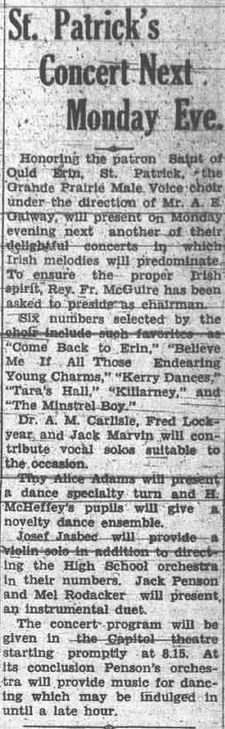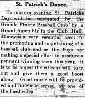 St. Patrick’s Day was widely celebrated in this area, often with dances.  As early as 1915, a St. Patrick’s Day dance was held in Grande Prairie.  In 1935 there was a St. Patrick’s Day concert of Irish music followed by a dance, with music by Penson’s orchestra.  A St. Patrick’s Day tea sponsored by the CWL featured a silk rug, hand worked by the St. Joseph’s Academy girls.  St. Patrick’s Day 1938 was marked in Sexsmith by a dance at the hall, where dollar bills were given out each hour.  A house party in the country east of Sexsmith had dancing and entertainment that went on until 5:30 AM.  To top it off, the March 16, 1915 paper had an ad on the front page placed by an Irish fellow looking for a wife.