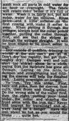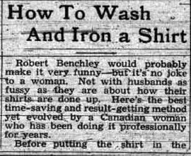 People must still iron, because you can still buy irons! There was a time, not that long ago, when two things were certain: professional men wore suits to work, which involved wearing a shirt (usually white) under the jacket, and women had to iron the shirts. They were horrible things to iron in the days before what was called “permapress.” I remember my mother telling me about a friend of hers whose husband was a bank manager. She got so tired of ironing two or three shirts a week that she came up with a new system. She ironed the collar and and a bit around it, and the cuffs and a bit up the sleeve, also a bit at the front. She figured since he never took his jacket off, she would only iron the parts that showed. I used this idea myself in the days when my husband had to wear a white shirt under a referee’s sweater – not sure how much time and effort it actually saved, but it just felt good to think that somehow I was beating the system. The newspapers, then as now, carried household hint columns and similar things – one I found was “How to Wash and Iron a Shirt.”