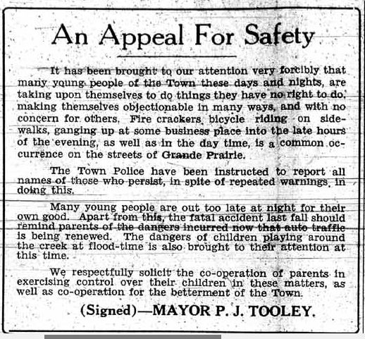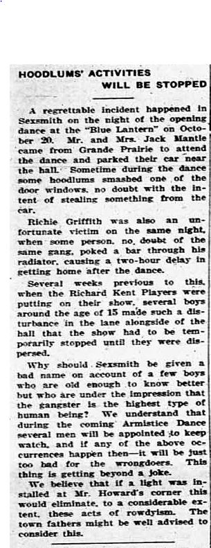I guess we like to think that “in the old days” when everything was better, problems with teenagers just didn’t happen. These two items, from 1934 and 1937, indicate otherwise. Perhaps some of the trouble the kids got into was different, but acts of vandalism seem to have been prevalent then as now, and with about as much point. Sexsmith’s answer to “hoodlums'” activities during dances was to post several men to keep watch, and there would be consequences.