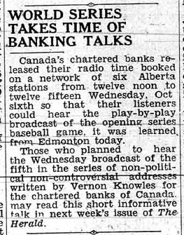 With so many ways to watch World Series Baseball now, it’s easy to forget there was a time when you were either at the game or could only listen to it on the radio.  In 1937, radio time had been booked by the Canadian Chartered banks for an informative talk, but they gave up the time for the broadcast of the opening game of the 1937 World Series between the New York Yankees and the New York Giants.  That move likely gave them more good publicity than their talks.