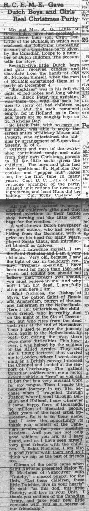 Captain Don Little of Beaverlodge organized a party for seventy-five Dutch children with the help of his unit. The men even sewed little cloth bags for the treats, which were contributed from their own Christmas parcels. Sinterklaas and Black Pete attended the party, which was the first for the children in several years. In appreciation, the soldiers were presented with a little dog named Dutchy as a mascot for their unit.