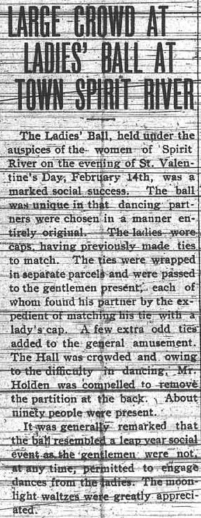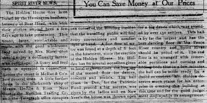 The February 18, 1915 Spirit River News mentions several businesses operating in Spirit River. Of note was the Holden House, which appears to have been a hotel and restaurant, with, as was common, a livery and feed barn “in connection.” An exciting feature of the building was a fine well found in the basement! The large second floor was used for dances with as many as 150 in attendance. An article about a “Ladies’ Ball” two years later indicates that dances were still being held there, and the building was still owned by Mr. Holden. The Ladies’ Ball was quite a unique format, being described as resembling a leap year social event.