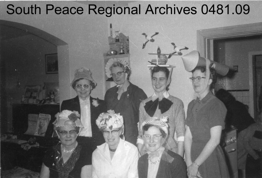 La Glace Just-A-Mere-Ladies Club group photo featuring their specially made hats. Ladies present include Isabelle Christiansen, Mabel Hagen, Alice Wartenbe, Gloria Cavanough, Glady Maple?, Jean Haakstad