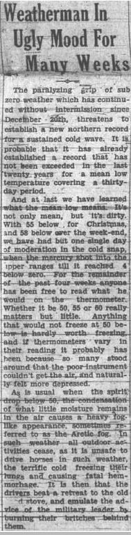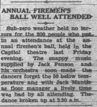 Bill Scott’s Potpourri in Friday’s paper mentioned the fairly warm winter we’ve been having.  I thought of that when I ran across this item from January 1935 about a cold spell which had lasted for over a month.  On top of the cold, there had been 21 inches of snow in January.  I remember going to school when it was -50 F (-45 C).  I’m not sure how we felt about it at the time, but looking back now, it seems like an adventure!  A short article in the same paper tells about the Firemen’s Ball which was attended by 200 people in spite of the 50 below temperature.  I’m like Bill, glad of the mild winter… fingers crossed!