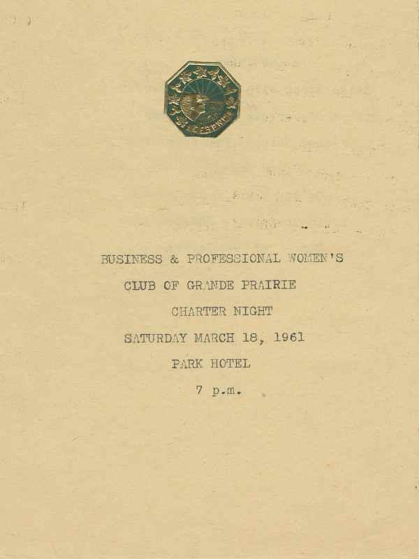 After organizing in 1960, the Business and Professional Women’s Club of Grande Prairie (see file 0032.08.06.397 in the Campbell family fonds) officially held its charter meeting on March 18, 1961. The group consisted of women from the area who were employed in various professions. The club operated as part of a larger organization, the Canadian Federation of Business and Professional Women, founded in 1930. The organization was global, with many countries having their own federations. The club aimed to develop professional leadership and business skills among women. Their specific purposes included encouraging women to participate in all levels of government and to improve economic and social conditions for women. Projects outlined by the Canadian Federation of Business and Professional Women in 1962 included: