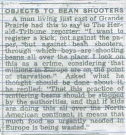 Sometimes I think some of the items in the paper are written with tongue firmly in cheek! This one, for example. I can think of lots of reasons why people would object to beans hooters, but starving people around the world would not be one of them. I had forgotten all about bean shooters until I read this article. They were kind of fun, as I recall, but also could be dangerous. But the argument against them put forth in this item is one I never dreamed of.