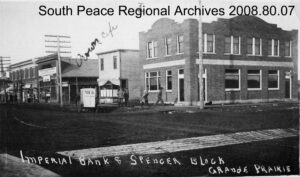 Image: Imperial Bank, former building to the left of the newly constructed one, and Spencer Block, Grande Prairie main street intersection, 1919 (SPRA 2008.080.07, Fonds