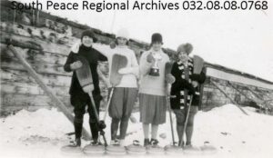 Above: Sexsmith curling ladies in 1928 posed with brooms, rocks, and a trophy. Skip Mrs. Brown (left), ?, Mrs. Ellsworth Foy (holding cup), and ? presumably