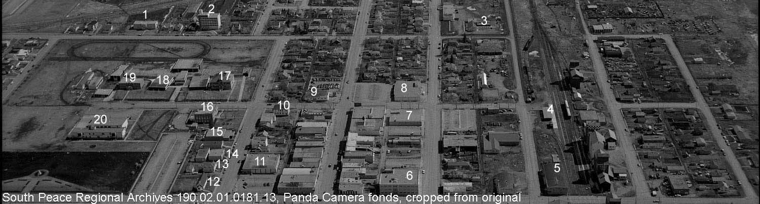 This aeriel was taken by Paul Pivert in 1968. Can you match the 20 Grande Prairie landmarks at the bottom of the page with the numbers on this photograph? First prize winner will receive a one year subscription to this newsletter. We will publish all the names of everyone who gets all the answers. Were any major landmarks missed? Send us an e-mail spra@telus.net and tell us what you remember. SPRA 190.02.01.0181.13