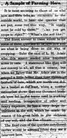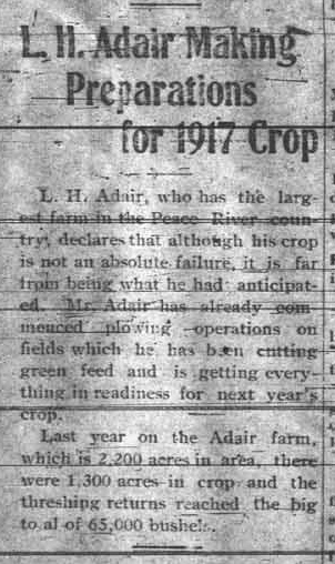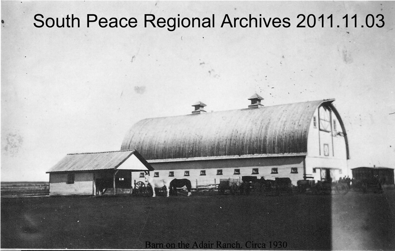 What do you know about Harry Adair? How he heard about the Peace Country, we don’t know, but Harry Adair set out from Montana in 1906 with 700 head of horses, assisted only by three women relatives and a few wranglers. He finally arrived here in 1909 and established a 2,200 acre ranch northwest of the fledgling community of Saskatoon Lake. Grande Prairie City wasn’t even a dream then. By 1913, he was seeding 900 acres of crop; and by 1917, 1300 acres, the largest ranch in the Peace Country. His ranch buildings, seen in the photos above, were the center of community life in that area. For the story about that exciting horse drive from Montana to the Grande Prairie, you’ll have to come to the Open Air Play on July 12th!