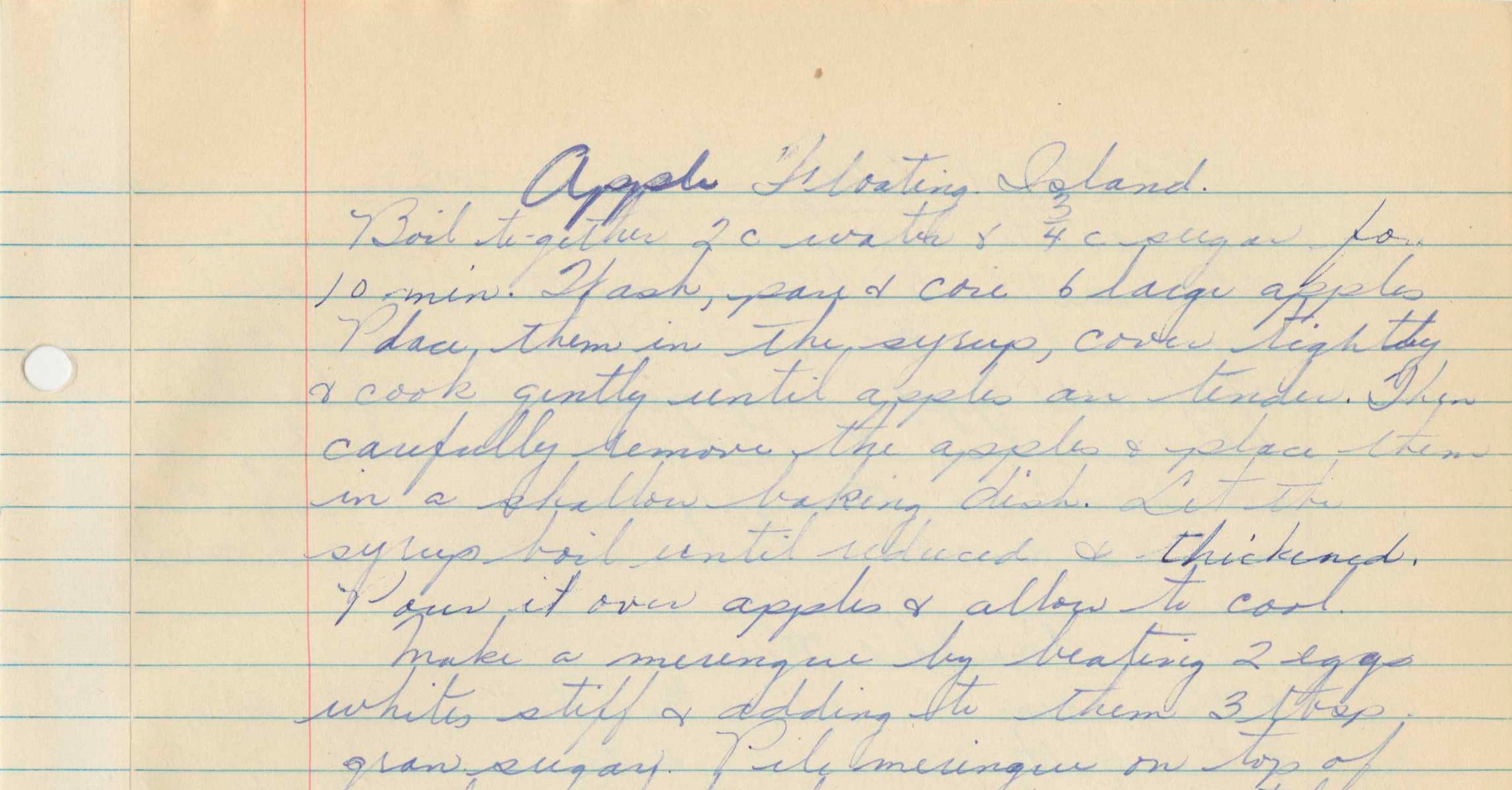 Make a meringue by beating 2 egg whites stiff & adding to them 3 tbsp. gran sugar. Pile meringue on top of apples & bake for 15 min. or until a delicate brown. With egg yolks make a custard sauce. Beat yolks slightly, add 2 tbsp. sugar mixed with a pinch of salt. Mix well & add 1 c. milk. Cook stirring constantly, until the mixture coats a metal spoon. Remove from fire & cool. Just before serving pour custard around apple.