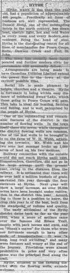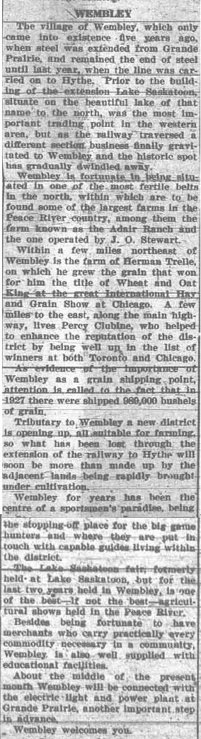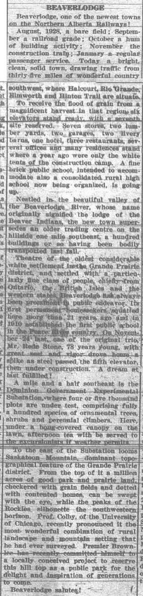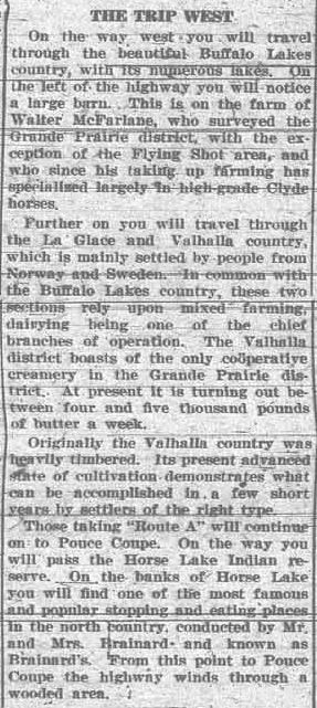 This week we are introducing a new feature called “Country Roads.” The last week of each month, the blog will highlight people, places and events in the County. The articles I chose to begin this new feature are from September 1929. The paper had write ups about the towns and districts surrounding Grande Prairie as part of an information package for a visiting contingent of members of the Canadian Chamber of Commerce. Including Chamber of Commerce members from every province, newsmen, and a group from Britain, there were over three hundred people. The visitors were divided into groups over two days, and taken in automobiles on a tour of the area. This week: “The Trip West.”