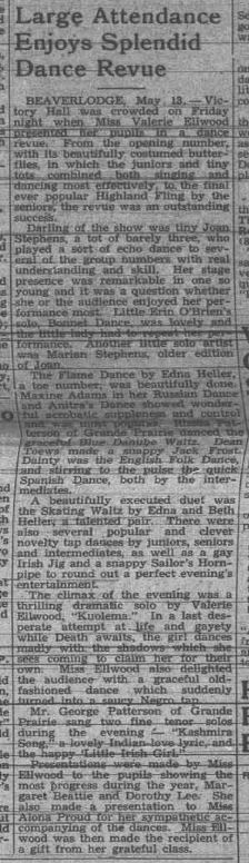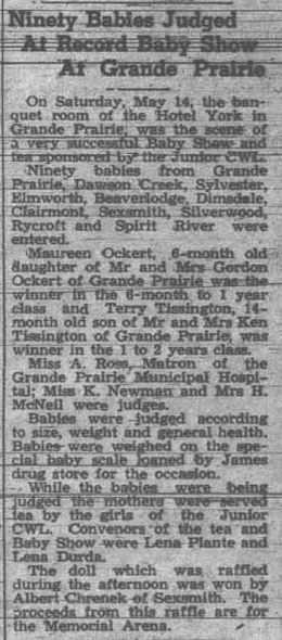 The 1940 item from Beaverlodge describes a very ambitious concert put on by the dance pupils of Miss Valerie Ellwood. It sounds like an enjoyable evening. In Grande Prairie in 1949, ninety babies from all over the district took part in a Baby Show & Tea, where the babies were judged according to weight, size, and general health. That’s a lot of babies! One of the fun things about articles from later years is that there are some familiar names.