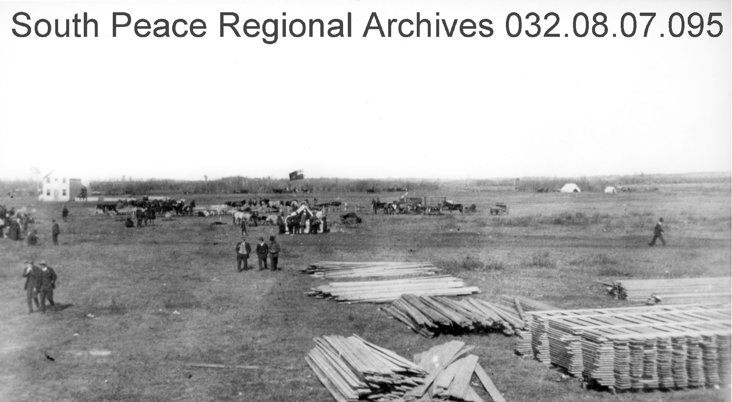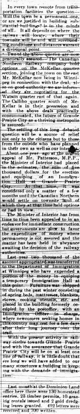 In his Editorial July 14, 1914, Wm. C. Pratt asks “Will the town be a permanent one or are we justified in building substantial buildings?” Pratt says that the “queries are now practically assured, as the railway now held leases on land approaching Grande Prairie”, thus “the future of Grande Prairie City as a thriving metropolis is assured.” Grande Prairie had avoided the fate of other towns which were bypassed by the railway and were either relocated or abandoned. He mentions at the end how busy Grande Prairie was with new settlers and inquiries. 130 homestead entries, 23 timber permits, 10 grazing rentals issued and 2 gold dredging leases granted by the Dominion Land office. 492 letters had been received and 700 written.
