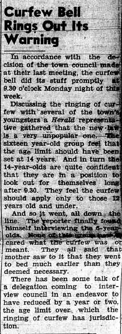 I doubt that teenagers today have ever experienced a town-mandated curfew time. A curfew had been imposed several years earlier that this resurrection, and according to one councilor, didn’t work then. Enforcement is always a problem. And my experience of curfews from many years ago, was that the only kids who paid attention to it weren’t the ones it was aimed at in the first place. I remember one time racing home on my bike after going to the 7 pm movie and a pop after with my friends. I was so concerned about getting home before the siren rang that I forgot about a broken sidewalk block, hit it, got thrown off my bike and got scraped up pretty badly, plus bent my bike wheel.