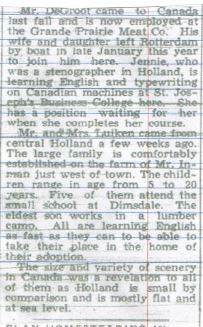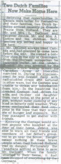 At the South Peace Regional Archives Society Annual General Meeting on Saturday, April 2, Dr. Daryl White is speaking about post-war immigration in the Peace.  When I spotted this article, it seemed to fit right in with that theme.  It was also interesting to me because my mother shopped at Mr. DeGroot’s meat shop, so I knew him and his daughter Jennie.  I certainly didn’t know anything about the events in Holland during the war.  The other family mentioned in the article had ten children!  I couldn’t find any further mention of them in the newspapers.