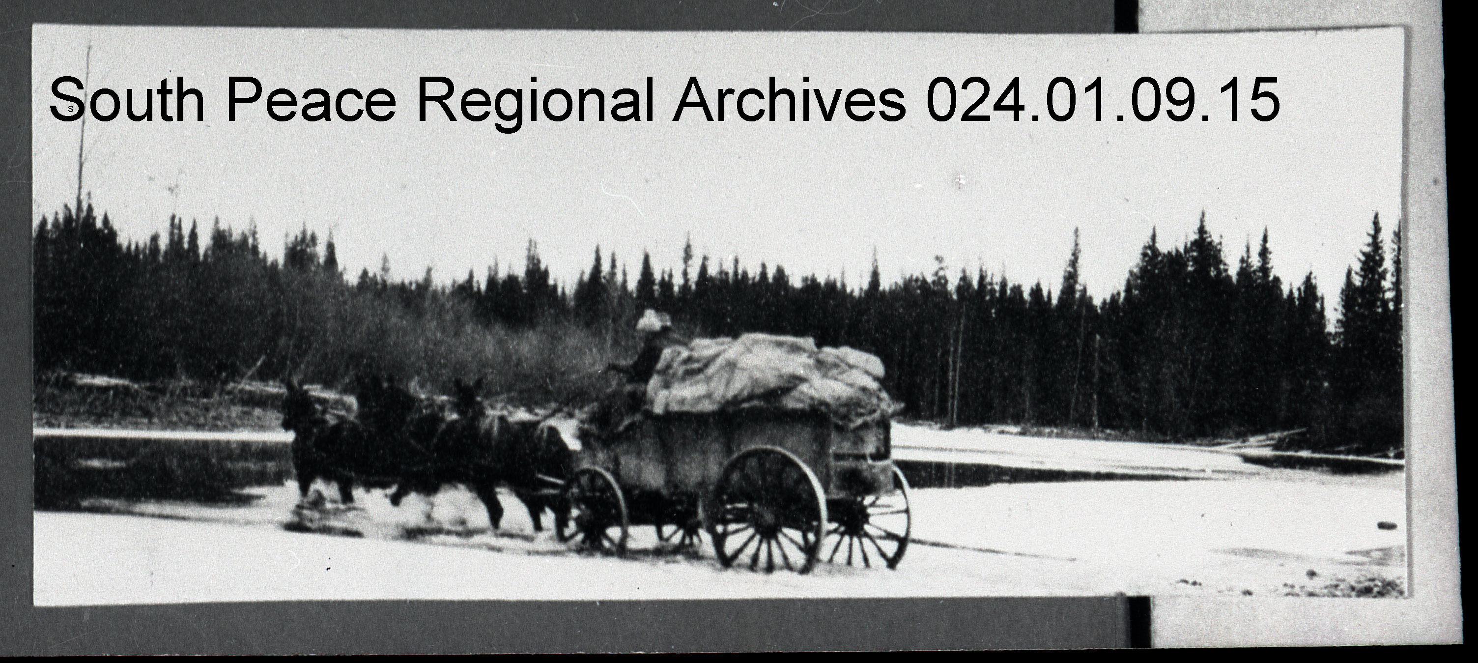 Buckskin Charlie driving the Mail Team across a river on the snowy Edson-Grande Prairie Trail. ~1912