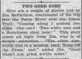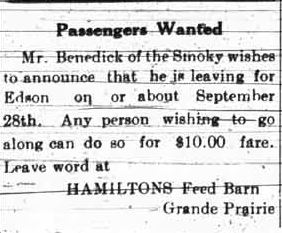Once again news was sparse for this week, but I did run across a couple of Edson Trail stories in a later paper. Since we seem to have had a lot of Edson Trail material lately I thought this would be a good place to use them. I found a short item Sept 22, 1914 where the editor of the paper was blowing his own horn a bit. I also noticed an ad “Passengers Wanted” placed by a fellow heading to Edson for supplies likely, willing to take passengers at $10. He may have had some takers, as the regular fare on the Grande Prairie to Edson Stage was $35.