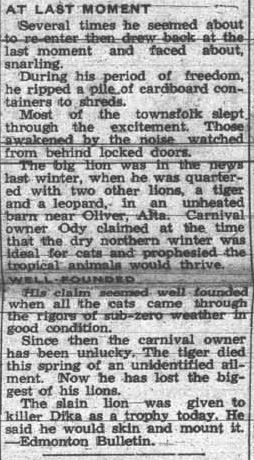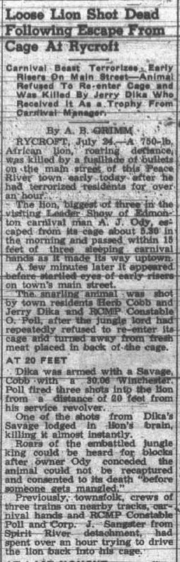 This month, Country Roads heads north to Rycroft for a sad story about a lion which escaped from a circus. While the lion did seem to have a bad attitude, he was likely confused and scared, much as the people trying to recapture him were. The incident took place early in the morning, so there were not many people about. Thanks to Bill Scott for sending me the article from the July 27, 1950 paper.