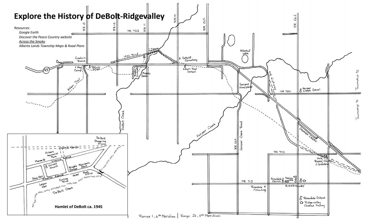 The “Explore the History” series in Telling Our Stories focuses on rural communities that were once more than what they are today. In this age of increasing urbanization and centralization, it is easy to forget that the much of the history of the South Peace Region is found in these places. Settlers arriving through the first half of the twentieth century settled largely in the countryside. They made their living farming or utilizing the natural resources the region offered. Distance, time, and poor roads were often obstacles to travel so, once arrived, people tended to work and play locally. As transportation improved and services centralized, many of these small communities faded into fond memories of their former selves.