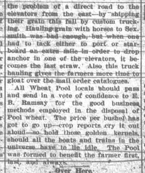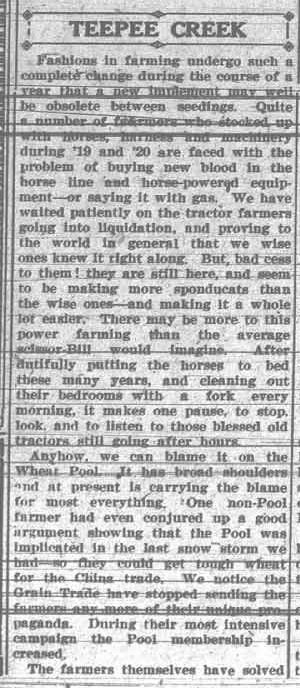 The Teepee Creek news correspondent looked around the neighbourhood and began to wonder if there was something to be said for power farming. The writer appears to have been one who favoured farming with horses, but was beginning to have some doubts. The references to the Wheat Pool seem to hint at dissatisfaction with the organization. Since its founding  in 1923, the Pool had had its ups and downs and not all the member farmers agreed with some of its policies and practices.