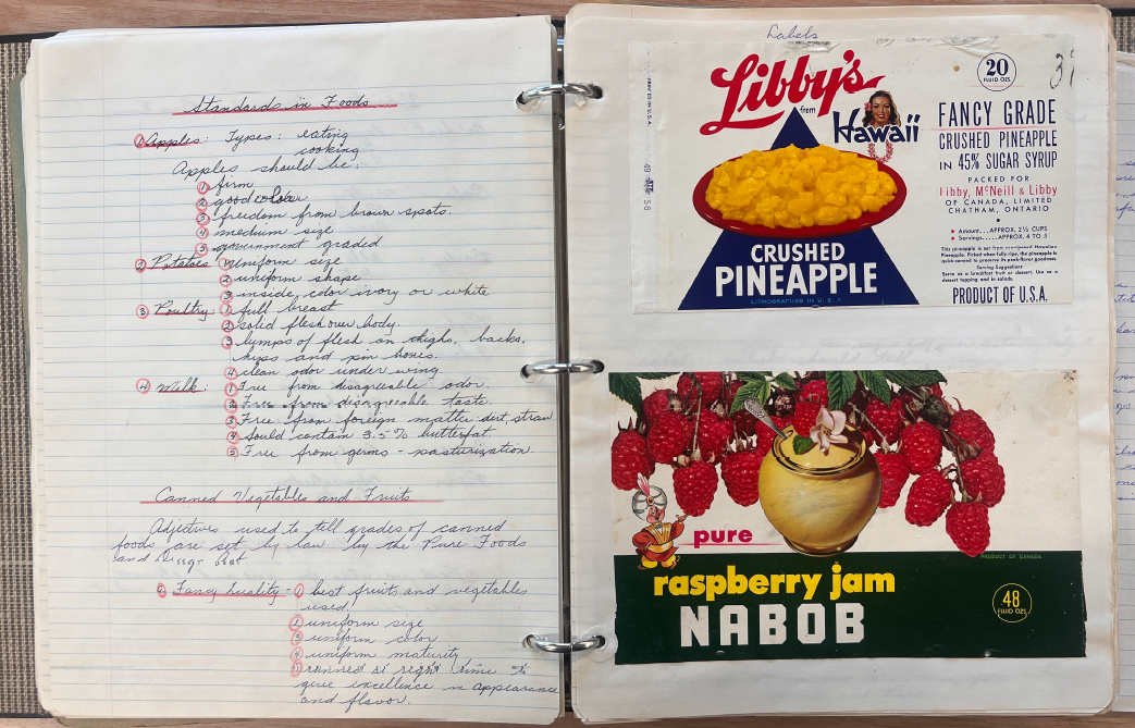 One of my favourite finds at the SPRA was one teacher’s binder holding materials for teaching science, likely created in the 1960s. On the first page in the binder, its subject matter—”science”—is spelled out from letters cut from construction paper, and a colourful picture cut from a magazine provides an illustration (see fig. 1). The picture brings together heroic-looking figures who each personify a different kind of work, from electrical and mechanical work to bench science and paperwork. Subsequent pages cover a wide range of topics, from vegetation and nutrition to genetics and electricity, and also include assorted clippings from newspapers, magazines, and other sources, including labels from food packaging (see image at the top), an article about fur coats (fig. 3), and advertisements for electrical appliances (fig. 4). Teresa Dyck, Access Coordinator at the Archives, helped me identify the binder’s maker as teacher Karen Burgess, who spent 11 years of her retirement (from 2002 to 2013) working at the Archives, where some of her work would have also involved collecting and organizing clippings from various sources, just as she had done for her science binder.