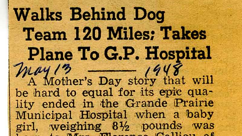 This first story is from a newspaper clipping from May 13, 1948. Mrs. Florence Calliou gave birth to a baby girl on Mother’s Day in the Grande Prairie Municipal Hospital after a long journey with her husband and two-year-old son. The journey began with a one hundred and twenty mile (193 KM) walk to reach Fort Nelson, which took eight days. Mrs. Calliou explained that the snow was still very deep where they were travelling through even though it was May! After their long walking journey, they got on a plane to Grande Prairie and traveled four-hundred miles (643 KM) in less than an hour. The baby was born shortly after their arrival to Grande Prairie and Dr. A. M. Carlisle said the baby was in good shape (SPRA 510.12.17.007).