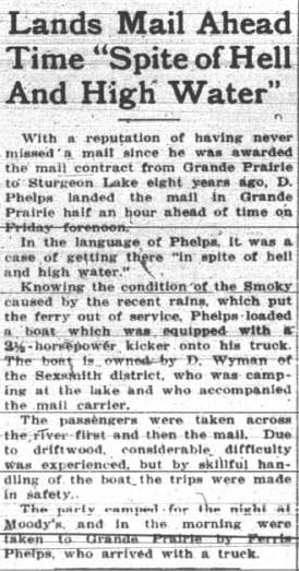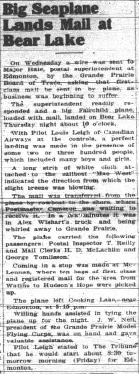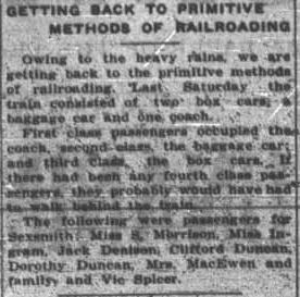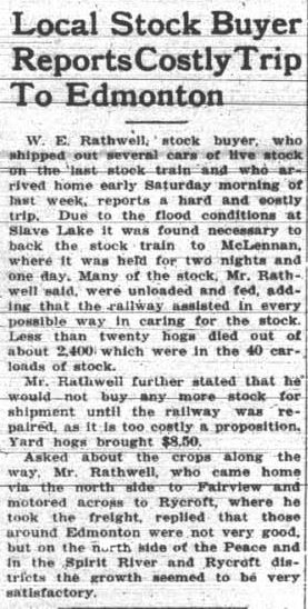 There were so many news items about the serious flooding throughout the area in June and early July of 1935. It seems the pioneering spirit was still very much alive, as most seem to have treated the situation as a great adventure and with ingenuity. (Note: In the item headlined “Stock Buyer Reports Costly Trip” I was fascinated by the statement that the train had been backed up from Slave Lake to McLennan, a distance of about 140 km)