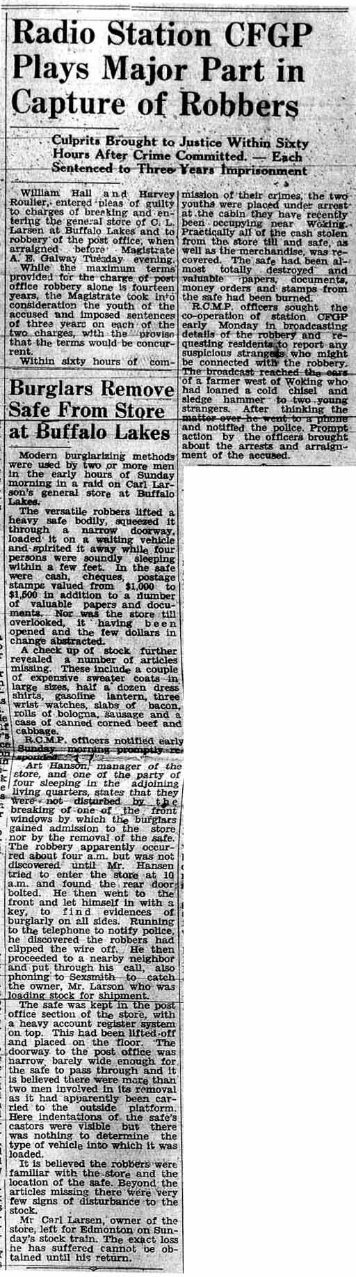 Burglars using “modern burglarizing methods” were foiled by radio station CFGP broadcasting details of the robbery and asking people to report any suspicious activity.  Kind of an early version of Facebook!  The robbers apparently didn’t have a very good escape plan.