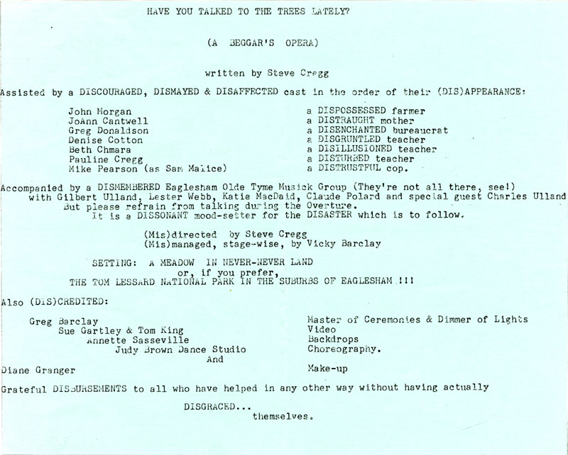 The group usually gave one or two performances a year, sometimes featuring a couple of plays, in Eaglesham, Tangent, and occasionally at festivals.