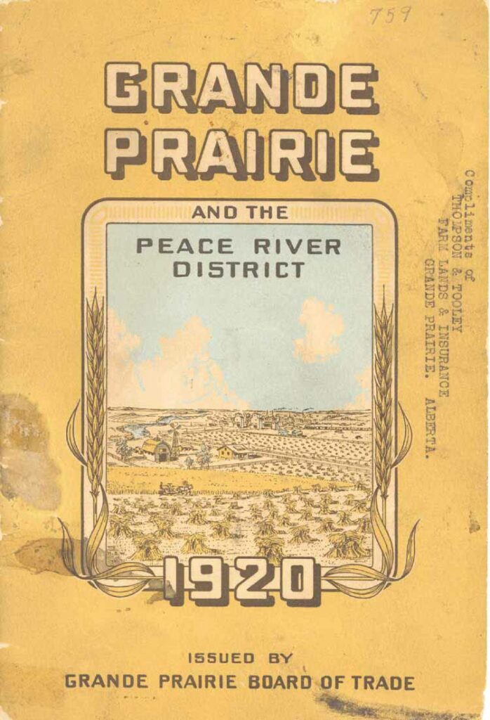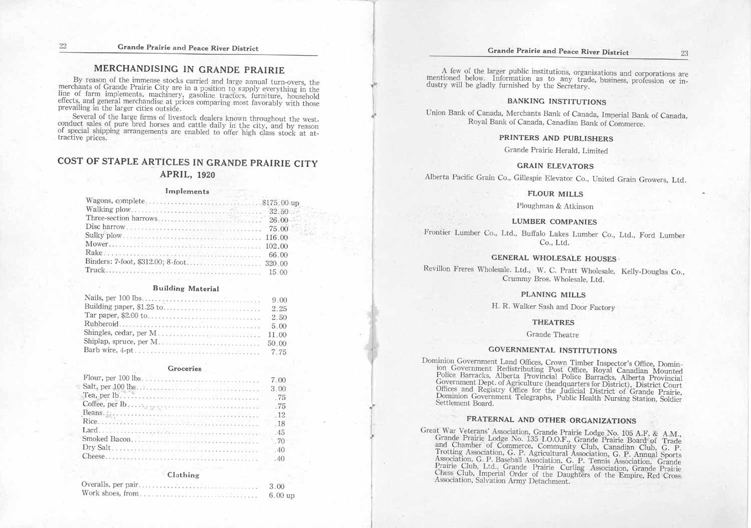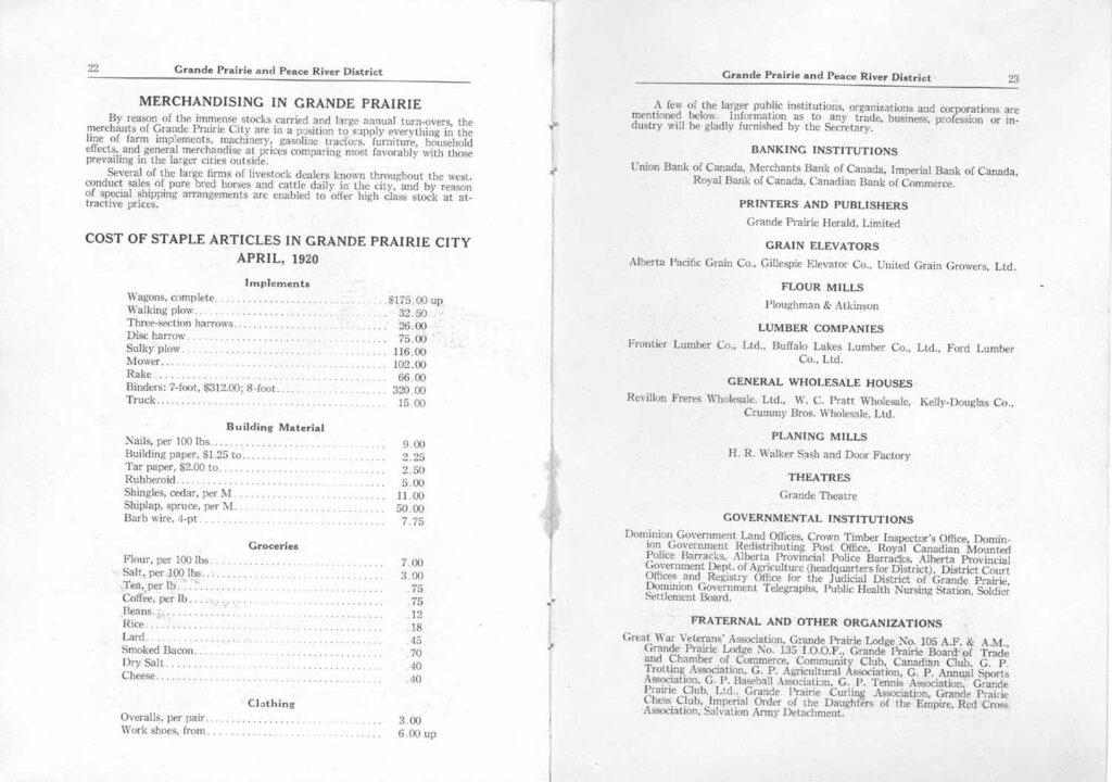 Todays “From the Vault Friday” features an excerpt from a booklet published by the Grande Prairie Board of Trade in 1920. The booklet, titled Grande Prairie and the Peace River District, 1920 was written to promote settlement of the area. Highlights of the document include a list of the costs of staple goods, local businesses and amenities, such as hunting, fishing, a public market place, fire hall, and various clubs and associations.