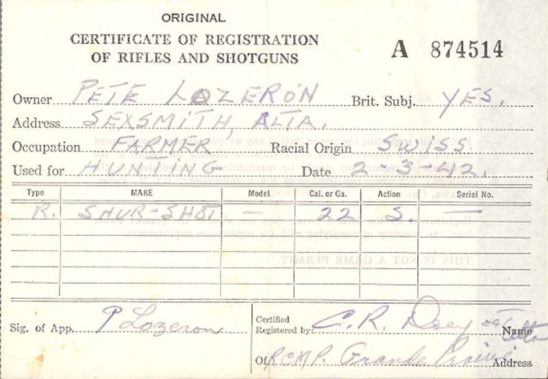 Today’s “From the Vault Friday” features a certificate of registration for a rifle from the Pierre Lozeron family fonds (Fonds 006). The gun, registered early 1942, was a .22 Shur-Shot single (?) action rifle that Pierre used for hunting. The certificate was signed by someone at the Grande Prairie RCMP detachment. At the time, it wasn’t required for the firearm to have a serial number, but it was unlawful to alter or deface numbers. During World War II, you had to register rifles and shotguns, but this was discontinued after the war ended.