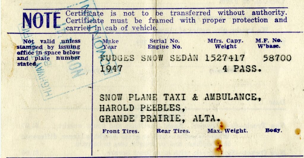 Todays “From the Vault Friday” features a snow plane taxi & ambulance license from the Harold Peebles fonds (Fonds 142). The license was issued to Harold Peebles c. 1947. It cost $21.00, which is approximately $265.29 in 2021 currency. Harold used the snow plane to run a taxi and ambulance service. The snow plane worked well in the winter months, when few Peace region roads were ploughed.