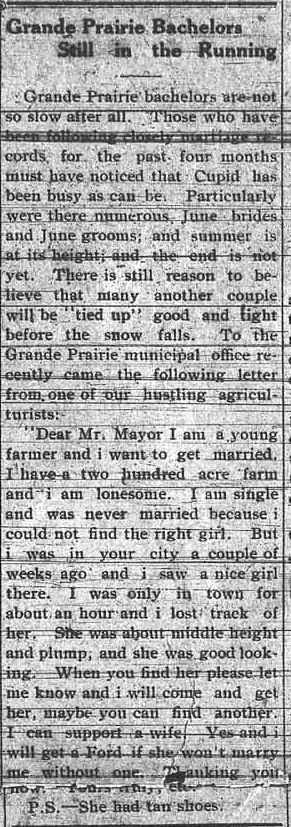 This article from page 1 of the July 10, 1917 paper mentioned how many marriages had taken place recently. and the expectation that there would be many more before the snow fell. These comments were followed by a letter received by the Mayor, asking him to act as a marriage broker, not a duty usually expected from a local politician. The description of the “nice girl” seen by the farmer was pretty vague, and I wonder if the Mayor was able to help the young farmer find a wife.