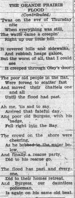A couple of weeks ago the blog was about Bear Creek flooding, and the narrow escape of Constable Burgess and a couple of other fellows when their boat overturned in the creek. This poem appeared in the May 17, 1935 Heraldgrams column. It appears as though the flood and the narrow escape in the icy flood waters was the talk of the town for quite some time.