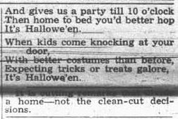 The Nov. 8, 1944 issue of the paper printed some Hallowe’en poems written by local High School students. The poems refer to all the same things we associate with Hallowe’en today – pumpkins, black cats, witches and ghosts.